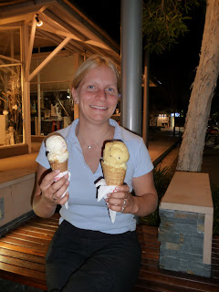 Abends fuhren wir mit dem Auto zum Main Beach und holten das nach, was wir nachmittags nicht sehen konnten. Wir bummelten durch die elegante Ladenstraße und waren begeistert vom weißen Pudersand am Strand. Wir fanden ein Restaurant, wo wir zu Abend aßen und gönnten uns auf dem Rückweg jeder zwei riesige Kugeln Eis.